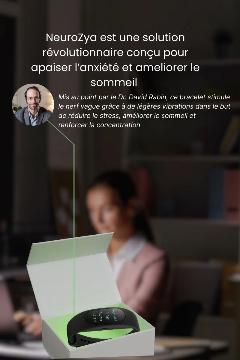 Inspirée des découvertes les plus récentes en neurosciences, la technologie du bracelet Neurozya envoie de légères impulsions vibratoires, conçues pour calmer le système nerveux et réduire l'anxiété en stimulant le système parasympathique. Il s’intègre simplement à votre quotidien, pour vous aider à retrouver du calme, du sommeil et de la concentration.