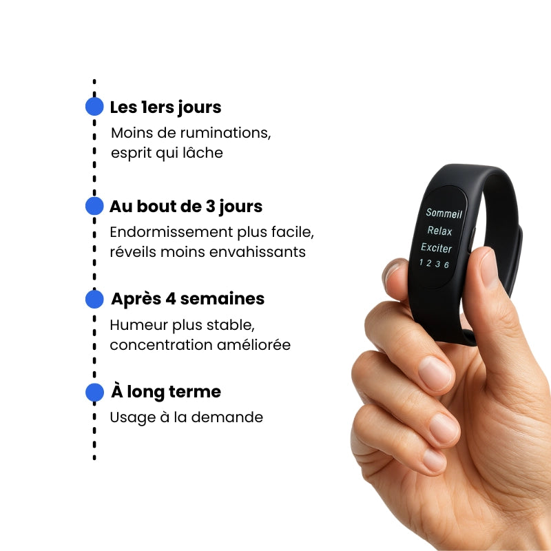 Notre bracelet agit par stimulation douce du nerf vague, un mécanisme reconnu pour réguler le stress et améliorer le sommeil. Contrairement aux compléments ou médicaments, il ne provoque pas de dépendance, ne nécessite pas de prise quotidienne, et offre un effet perceptible dès les premières utilisations.
